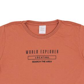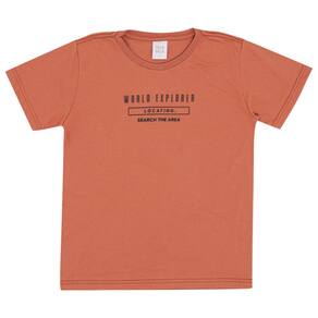 Ideal para acompanhar seu pequeno em momentos de diversão! Camiseta meia malha na cor ferrugem com gola reforçada e estampa gel relevo com escrita "explorador do mundo, localizado, pesquisa a área" e bermuda moletom na cor carbono com estampa de animais.