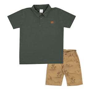 Arrumadinho e estiloso para ocasiões e momentos especiais do seu garotinho. Composto por camiseta modelo polo piquet com elastano na cor militar, gola com abertura de botões e etiqueta termocolante. Já a bermuda sarja na cor caramelo possuí estampa digital com árvores e folhagens.