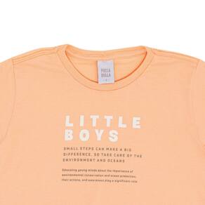 Looks confortáveis para os meninos aproveitarem os dias quentes. Confeccionada em meia malha a camiseta na cor pêssego é leve e confortável, possuí estampa frontal com escrita e gola redonda reforçada, já a bermuda em moletom linho possuí estampa de folhas sublimada na cor chá verde.