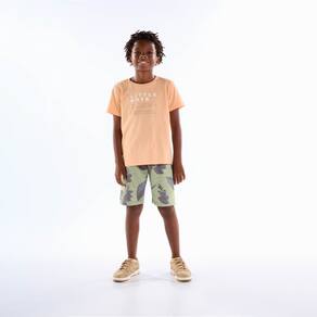 Looks confortáveis para os meninos aproveitarem os dias quentes. Confeccionada em meia malha a camiseta na cor pêssego é leve e confortável, possuí estampa frontal com escrita e gola redonda reforçada, já a bermuda em moletom linho possuí estampa de folhas sublimada na cor chá verde.