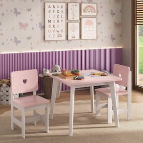 Combinada com a Cadeira Infantil Sofia, o conjunto transforma qualquer ambiente em um espaço mais alegre e acolhedor. As cadeiras possuem estrutura em madeira maciça de pinus com acabamento em verniz, que valoriza o tom natural da madeira. As partes em MDF recebem pintura laqueada com brilho fosco, unindo estilo e resistência. Acabamento da Cadeira/Banco: Verniz Acabamento da Mesa: Verniz Acompanha Manual de Instalação: Sim Ambiente Principal: Quarto Infantil Cadeira/Banco estofada: Não Cadeira/Banco suporta até: 30 kg codigo_ean: 7900288203786 Complexidade da Montagem: Baixa: pode ser montado por uma pessoa sozinha Configuração do Conjunto: Mesa com Cadeiras Cor: branco / rosa Cor do Produto: Branco / Rosa Design da Base: Padrão Enchimento do Encosto: MDF Escala de Brilho: Semi-Brilho Espessura do Tampo: 15 mm Estrutura do Assento: MDF Estrutura do Encosto: MDF Formato do Tampo: Quadrado Itens Inclusos: 1 Mesa, 2 Cadeiras, Kit Ferragens e Manual de Montagem Linha ou Coleção: Sofia Manual de Montagem e Instalação: https://product-hub-prd.madeiramadeira.com.br/405932442/documents/6a9e2d81-d4a5-48a0-bdeb-9f70191673e4308883557441753210868526.pdf Marca: Empório Paraíso Material da Base da Mesa: MDF Material da Estrutura da Cadeira: Madeira Maciça Material do Tampo: MDF Material Principal: Madeira Maciça Material Principal das Cadeiras/Bancos: Madeira Maciça Medida da Cadeira/Banco (A x L x P): 57,5X29X31 Medida da Mesa (A x L x P): 48X60X60 Medida do Tampo (L x C x E): 60X60X1,5 Mesa Dobrável: Não Mesa Extensível: Não Mesa suporta até: 15 kg Necessita Montagem: Sim Origem do Produto: Nacional Peso da Cadeira/Banco: 2,9 kg Peso da Mesa: 6 kg Possui Apoio para Braços: Não Possui Apoio Para os Pés: Não Possui Prateleiras: Não Possui Rodízio: Não Possui Suporte Giratório: Não Possui Vidro: Não Quantidade de Cadeiras: 2 Recomendações de Uso, Manutenção e Limpeza: Limpar Com Pano Seco Sistema de Montagem: Parafusos Tipo de Assento: Fixo Tipo de Encosto: Fixo Marca: Não Informado