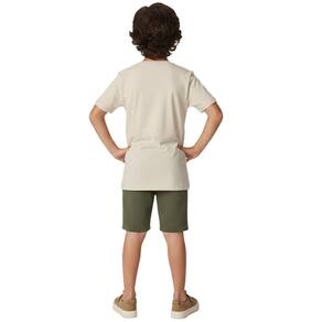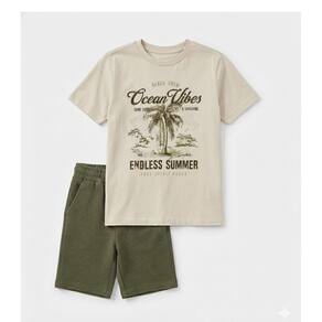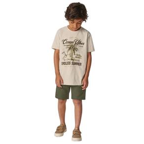Conjunto Infantil Ocean Vibes confeccionado em Meia Malha e Gorgurinho leve, ideal para os dias de calor. A camiseta bege com estampa "Ocean Vibes" traz um visual moderno e descontraído, enquanto a bermuda verde em malha canelada proporciona conforto, liberdade de movimento e caimento agradável. A cintura com elástico facilita o vestir e se ajusta bem ao corpo.