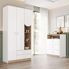 O Conjunto Infantil Magia foi desenvolvido para oferecer praticidade, e aconchego no dia a dia do bebê. O conjunto é composto por guarda roupa e cômoda garantindo organização, conforto e versatilidade para o quarto. O guarda-roupa conta com cabideiro reforçado, prateleiras bem distribuídas e gavetas com corrediças telescópicas, proporcionando amplo espaço para roupas, acessórios e brinquedos. A cômoda traz 3 gavetas espaçosas com corrediças telescópicas e um nicho aberto para decoração ou itens de uso diário, unindo praticidade e estilo. Produzido em material de alta qualidade e acabamento resistente, o Conjunto Infantil Magia é a escolha ideal para criar um ambiente organizado, funcional e acolhedor.