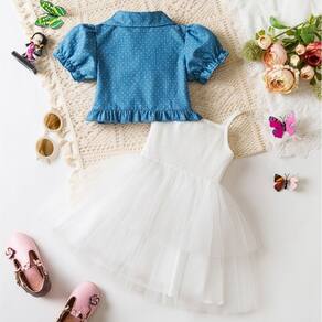 Encante-se com a delicadeza deste conjunto infantil composto por vestido Branco em tule com laço azul e casaquinho jeans leve com estampa de borboletas. Um look encantador para ocasiões especiais, festas ou passeios, garantindo estilo e conforto para sua pequena.