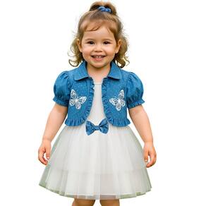O vestido possui saia de tule em camadas, alcinhas finas e laço frontal, transmitindo charme e suavidade. O casaquinho jeans acompanha o conjunto, com detalhes de babados e estampa de borboletas, trazendo um toque moderno e gracioso.