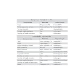 Ficha técnica: Tensão: 250V Amperagem: 10A ou 20A Certificação compulsória: Sim Normas: NBR NM 60884-1 e NBR 60669-1 Ean: 7898493995902
