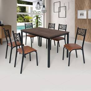 Este tipo de material é muito superior que os acabamentos em Pintura UV (que acaba sendo o tipo mais utilizado na fabricação dos móveis). Medida da Mesa (A x L x P): 78cm x 80cm x 136cm Peso da Mesa: 19,96 kg Mesa suporta até: 10 kg Acabamento da Cadeira/Banco: Pintura Epóxi Acabamento da Mesa: Pintura Epóxi Acompanha Manual de Instalação: Sim Almofada do assento: Removível Almofada do encosto: Não Possui Altura do Conjunto: 78 cm Ambiente Principal: Cozinha Cadeira/Banco estofada: Somente Assento Estofado Cadeira/Banco suporta até: 100 kg Complexidade da Montagem: Baixa: pode ser montado por uma pessoa sozinha Cor: Preto Fosco/Caramelo/Amendoa Cor da Base: Preto Cor do Produto: Preto Fosco/Caramelo/Amendoa Cor do Tampo: Marrom Cor Secundária: Marrom De Canto (Canto Alemão): Não Design da Base: 4 Pés Escala de Brilho: Fosco Espessura do Tampo: 30 mm Estrutura do Assento: Madeira/Espuma/Sintético Estrutura do Encosto: Aço Formato do Tampo: Retangular Itens Inclusos: 1 Base de Mesa, 6 Cadeiras, 1 Tampo de Madeira, Kits de Parafusos e manual de montagem Linha ou Coleção: Jade Manual de Montagem e Instalação: https://product-hub-prd.madeiramadeira.com.br/910777/documents/d2a8701e-7ea3-4a82-9781-47f164de849d198673260017168990083847.pdf Material da Base da Mesa: Aço Carbono Material da Estrutura da Cadeira: Aço Carbono Material do Tampo: BP Material Principal: Aço Carbono Material Principal das Cadeiras/Bancos: Aço Carbono Medida da Cadeira/Banco (A x L x P): 91cm x 49cm x 37cm Medida do Tampo (L x C x E): 80cm x 136cm x 3cm Mesa Dobrável: Não Mesa Extensível: Não Necessita Montagem: Sim Origem do Produto: Nacional Peso da Cadeira/Banco: 3,65 kg Possui Apoio para Braços: Não Possui Apoio Para os Pés: Não Possui Prateleiras: Não Possui Rodízio: Não Possui Suporte Giratório: Não Possui Vidro: Não Quantidade de Cadeiras: 6 Quantidade de Lugares: 06 Recomendações de Uso, Manutenção e Limpeza: Não utilizar produtos quimicos na limpeza, nâo expor a chuva, nâo reclinar, nâo pisar Sistema de Montagem: Parafusos Tipo de Assento: Removível Tipo de Encosto: Fixo