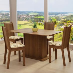 A mesa retangular acomoda até quatro pessoas. O tom amadeirado agrega beleza ao produto e combina com os mais variados ambientes. Muito práticas, as cadeiras são fabricadas em MDF e MDP, com encosto em pintura e assento estofado.