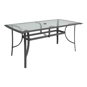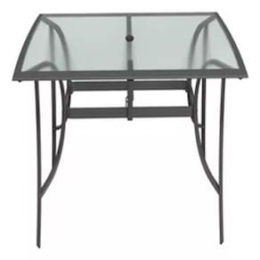 Mesa Robusta: Fabricada em alumínio cinza, com dimensões de 72 cm de altura, 88 cm de largura e 168 cm de comprimento, ela vem com um tampo de vidro elegante e um furo central para o ombrelone, proporcionando funcionalidade e estilo.