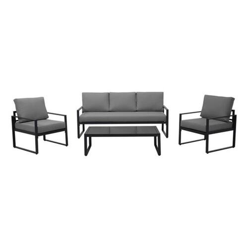 Conjunto de Estar Melbourne 4 Pecas em Metal da marca Just Home Collection. Este conjunto de jardim cinza e composto por uma mesa, quatro cadeiras e um ombrelone para garantir conforto e praticidade no seu espaco externo. As pecas possuem estrutura em aco e superficie em textileno, ideal para resistir as intemperies do tempo. Com capacidade para acomodar ate 5 pessoas, este conjunto e perfeito para reunir amigos e familiares em momentos de lazer ao ar livre. Adquira ja o seu e transforme a sua area externa em um ambiente aconchegante e sofisticado