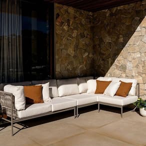 Os tecidos são especialmente selecionados para suportar a exposição solar, mantendo as cores vibrantes e resistentes ao desbotamento. E, para maior praticidade, todas as almofadas são removíveis, pois, apesar do enchimento em espuma de alto desempenho, não devem ser expostas à chuva.