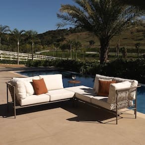 Os tecidos são especialmente selecionados para suportar a exposição solar, mantendo as cores vibrantes e resistentes ao desbotamento. E, para maior praticidade, todas as almofadas são removíveis, pois, apesar do enchimento em espuma de alto desempenho, não devem ser expostas à chuva.