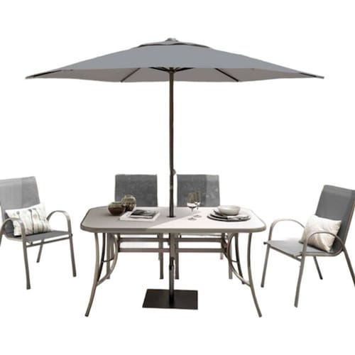 A mesa, com dimensoes de 71x90x150 cm, possui um tampo de vidro resistente e inclui um furo central para acomodar o ombrelone, garantindo sombra e conforto nos dias ensolarados. As cadeiras, com dimensoes de 91x55x69 cm, tem assentos e encostos em textilene, material conhecido pela sua resistencia e facilidade de limpeza.