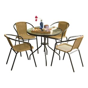 Estilo e conforto se unem neste elegante Conjunto de Jardim RIO, ideal para transformar varandas, terracos e areas externas em ambientes acolhedores e sofisticados. Com 4 cadeiras empilhaveis e uma mesa redonda com tampo de vidro temperado, este conjunto e perfeito para momentos de lazer ao ar livre.