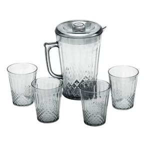 Textura trabalhada em relevo que remete ao cristal, conferindo visual refinado Jarra com alça ergonômica e tampa com vedação firme, evitando derramamentos Conjunto perfeito para sucos, água, chás gelados, refrigerantes e muito mais 4 copos que acompanham o conjunto: leves, empilháveis e fáceis de lavar Ideal para uso diário, recepções, eventos, escritórios, churrascos ou encontros