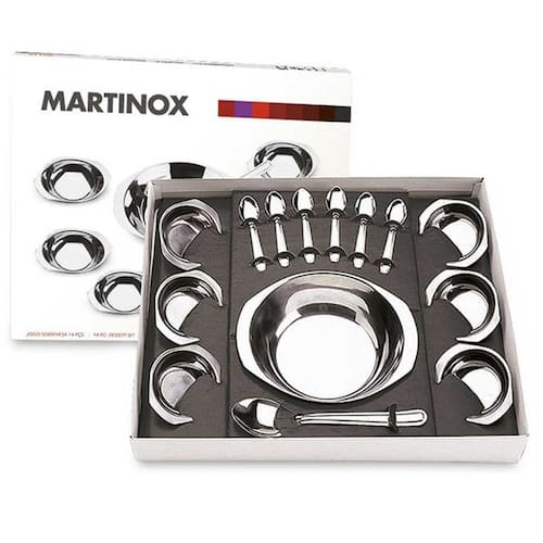 Totalmente feito de aço inox, por isso não solta nenhum resíduo nos alimentos,mantendo-os saudáveis. Altamente durável mantém suas características , preservando a beleza, a higiene e a durabilidade do material. Beleza e praticidade em seu design. Ideal para servir. Acabamento em brilho. Higiênico e de fácil limpeza. Pode ser lavado diariamente na máquina de lavar louças. O Peso e as medidas que aparecem no campo características são referentes a embalagem do produto. Contém: 06 - Tigelas de sobremesa de inox 06 - Colheres de sobremesa de inox 01 - Colher de inox grande 01 - Travessa de inox grande Ean: 7896479950143