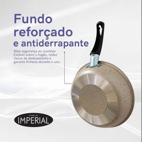 O conjunto de panelas com a qualidade que sua família merece e o precinho que seu bolso merece Esse conjunto de panelas é de alumínio com revestimento em teflon antiaderente, isso mesmo, a comida não gruda O revestimento antiaderente é por dentro e por fora, o que facilita muito a limpeza das panelas e aumenta bastante o tempo de vida útil das suas panelas. Todos as panelas da marca Imperial são testadas, aprovadas e vão com selo de qualidade Inmetro, garantindo a segurança e a saúde da sua família, além de comprovar a qualidade do produto que é submetido a testes rigorosos antes de ir para sua casa. Todas as panelas desse conjunto possuem tampa de vidro temperada que são super resistentes, quase impossível de quebrar, as tampas também possuem saída de vapor que é item de segurança imprescindível para sua familia. Todos os cabos e poméis são de baquelite, material que não esquenta para garantir sua segurança na hora do preparo dos alimentos.