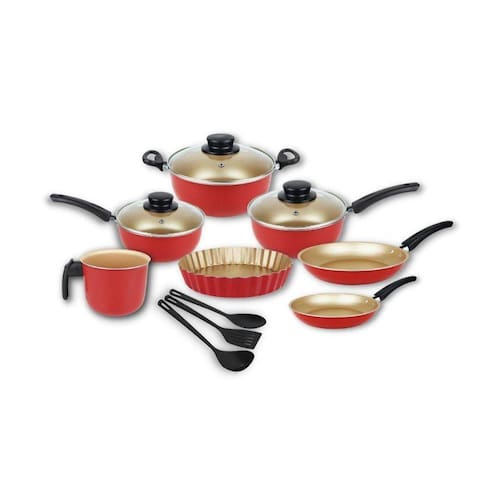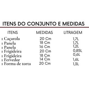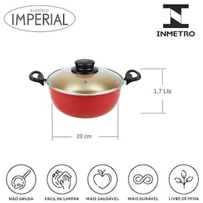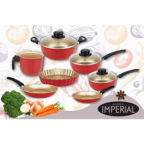 Conjunto Jogo Panelas 10 Peças Antiaderente Teflon O conjunto de panelas com a qualidade que sua família merece e o precinho que seu bolso merece Esse conjunto de panelas é de alumínio com revestimento em teflon antiaderente, isso mesmo, a comida não gruda O revestimento antiaderente é por dentro e por fora, o que facilita muito a limpeza das panelas e aumenta bastante o tempo de vida útil das suas panelas. Todos as panelas da marca Imperial são testadas, aprovadas e vão com selo de qualidade Inmetro, garantindo a segurança e a saúde da sua família, além de comprovar a qualidade do produto que é submetido a testes rigorosos antes de ir para sua casa. Todas as panelas desse conjunto possuem tampa de vidro temperado que são super resistentes, quase impossível de quebrar, as tampas também possuem saída de vapor que é item de segurança imprescindível para sua familia. Todos os cabos e poméis são de baquelite, material que não esquenta para garantir sua segurança na hora do preparo dos alimentos. Composição do conjunto: 1 caçarola Nº 20 1 panela Nº 18 1 panela Nº 16 1 frigideira Nº 20 1 frigideira Nº 18 1 fervedor Nº 14 1 forma de torta Nº 20 3 talheres de nylon Marca: Alumínio Imperial