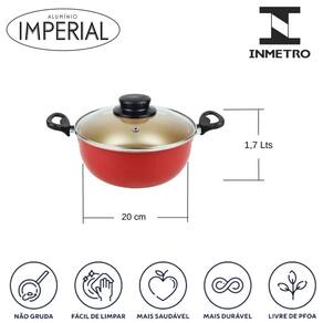 Conjunto Jogo Panelas 10 Peças Antiaderente Teflon O conjunto de panelas com a qualidade que sua família merece e o precinho que seu bolso merece Esse conjunto de panelas é de alumínio com revestimento em teflon antiaderente, isso mesmo, a comida não gruda O revestimento antiaderente é por dentro e por fora, o que facilita muito a limpeza das panelas e aumenta bastante o tempo de vida útil das suas panelas. Todos as panelas da marca Imperial são testadas, aprovadas e vão com selo de qualidade Inmetro, garantindo a segurança e a saúde da sua família, além de comprovar a qualidade do produto que é submetido a testes rigorosos antes de ir para sua casa. Todas as panelas desse conjunto possuem tampa de vidro temperado que são super resistentes, quase impossível de quebrar, as tampas também possuem saída de vapor que é item de segurança imprescindível para sua familia. Todos os cabos e poméis são de baquelite, material que não esquenta para garantir sua segurança na hora do preparo dos alimentos.