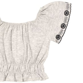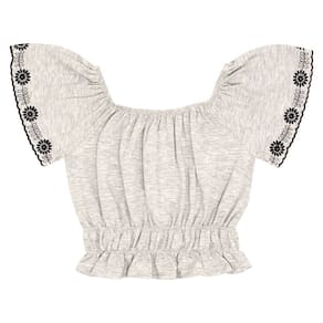 Conjunto composto por blusa e short. A blusa em meia malha na cor mescla banana com elástico na gola e franzido na cintura, mangas com detalhe de bordado diferenciado. Já o short modelo bengaline preto metalizado possuí bolsos funcionais e elástico no cós para maior conforto e movimentação.