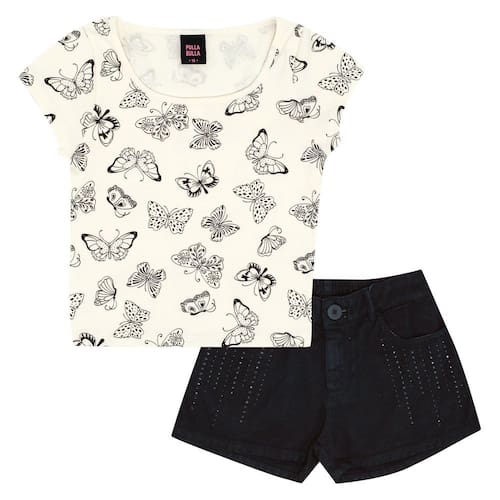 Conforto e leveza para qualquer ocasião do dia a dia. Conjunto composto por blusa ribana com elastano leve na cor off white, possuí gola arredondada e estampa de borboletas por toda peça. Já o short sarja na cor preto possuí bolsos funcionais, fechamento com botão frontal e aplicação de strass deixando a peça ainda mais charmosa.