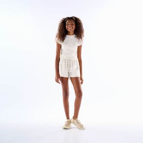 Este é para todas as fashionistas que adoram um look diferente, moderno e charmoso. Composto por blusa cotton leve na cor off white com bordado paetê de flores e gola redonda reforçada. Já o short é em tecido xadrez off white fio tinto e helanca, possuí amarração com cordão. Indispensável no armário das meninas.
