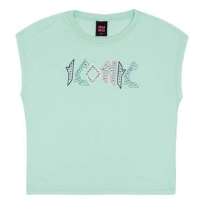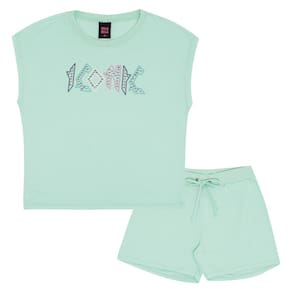 Para meninas que gostam de manter o estilo com o roupas confortáveis e despojadas. Conjunto na cor tiffany composto por blusa meia malha com aplique frontal metalizado escrito "Icônico" e short moletino com elástico no cós para maior conforto e movimentação. Detalhes encantadores e básicos do jeito que elas amam.