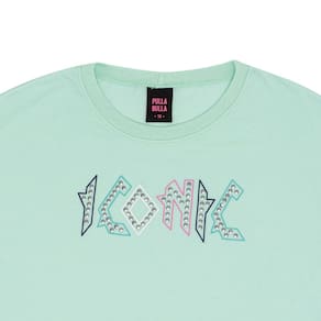 Para meninas que gostam de manter o estilo com o roupas confortáveis e despojadas. Conjunto na cor tiffany composto por blusa meia malha com aplique frontal metalizado escrito "Icônico" e short moletino com elástico no cós para maior conforto e movimentação. Detalhes encantadores e básicos do jeito que elas amam.