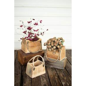 Visual feito à mão e exclusivo para qualquer área da sua casa! Este conjunto de três plantadores de bolsas de mão é perfeito para exibir sua planta ou suculenta favorita. Grande: 8" x 5" x 6,5" t Médio: 7" x 5" x 6" t Pequeno: 6" x 4" x 5" t Código UPC: 841628199765 O conjunto inclui 3 peças. Limpe com um pano seco e sem fiapos. Madeira inacabada. A umidade ou a água podem manchar a madeira. Sempre use um forro protetor.