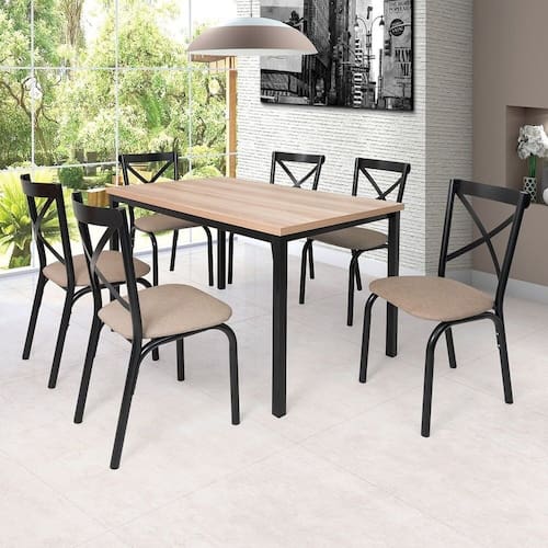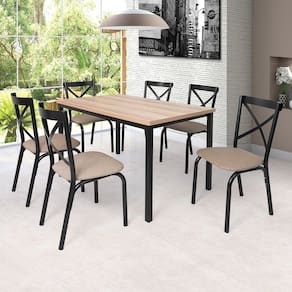 Este tipo de material é muito superior que os acabamentos em Pintura UV (que acaba sendo o tipo mais utilizado na fabricação dos móveis). Medida da Mesa (A x L x P): 78cm x 80cm x 136cm Peso da Mesa: 19,96 kg Mesa suporta até: 10 kg Acabamento da Cadeira/Banco: Pintura Epóxi Acabamento da Mesa: Pintura Epóxi Acompanha Manual de Instalação: Sim Almofada do assento: Removível Almofada do encosto: Não Possui Altura do Conjunto: 78 cm Ambiente Principal: Cozinha Cadeira/Banco estofada: Somente Assento Estofado Cadeira/Banco suporta até: 100 kg Complexidade da Montagem: Baixa: pode ser montado por uma pessoa sozinha Cor: Preto Fosco/Linho Bege Cor da Base: Preto Cor do Produto: Preto Fosco/Linho Bege Cor do Tampo: Bege Cor Secundária: Bege De Canto (Canto Alemão): Não Design da Base: 4 Pés Escala de Brilho: Semi-Brilho Espessura do Tampo: 30 mm Estrutura do Assento: Madeira/Espuma/Sintético Estrutura do Encosto: Aço Formato do Tampo: Retangular Itens Inclusos: 1 Base de Mesa, 6 Cadeiras, 1 Tampo de Madeira, Kits de Parafusos e manual de montagem Linha ou Coleção: Karina Manual de Montagem e Instalação: https://product-hub-prd.madeiramadeira.com.br/910608/documents/0b6b42f8-7c9f-44f7-bed0-df349b39ae21198468060017168307630292.pdf Material da Base da Mesa: Aço Carbono Material da Estrutura da Cadeira: Aço Carbono Material do Tampo: BP Material Principal: Aço Carbono Material Principal das Cadeiras/Bancos: Aço Carbono Medida da Cadeira/Banco (A x L x P): 90cm x 50cm x 53cm Medida do Tampo (L x C x E): 80cm x 136cm x 3cm Mesa Dobrável: Não Mesa Extensível: Não Necessita Montagem: Sim Origem do Produto: Nacional Peso da Cadeira/Banco: 4,25 kg Possui Apoio para Braços: Não Possui Apoio Para os Pés: Não Possui Prateleiras: Não Possui Rodízio: Não Possui Suporte Giratório: Não Possui Vidro: Não Quantidade de Cadeiras: 6 Quantidade de Lugares: 06 Recomendações de Uso, Manutenção e Limpeza: Não utilizar produtos quimicos na limpeza, nâo expor a chuva, nâo reclinar, nâo pisar Sistema de Montagem: Parafusos Tipo de Assento: Removível Tipo de Encosto: Fixo