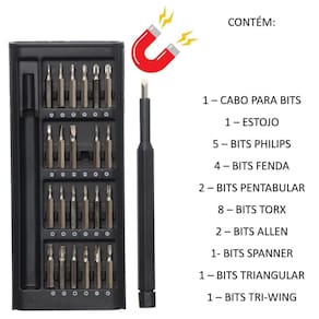 Diversos tipos de pontas fenda, philips, torx, allen, y : com 24 pontas intercambiáveis de diferentes tipos, você terá a ferramenta certa para qualquer tarefa, economizando tempo e esforço.