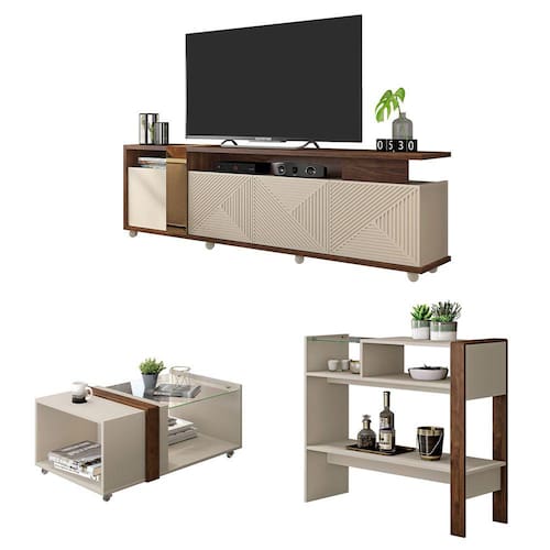 O Kit Columbus irá completar seu ambiente, possui elegância além de um design único e exclusivo. Possui 1 Bancada + 1 Mesa de Centro + 1 Aparador que vão te surpreender. Feito em MDP, MDF e HDF possui maior durabilidade e resistência, transmitindo maior segurança ao móvel.Dimensões do Produto Montado:(Bancada)Altura: 62 cmLargura: 199,5 cmProfundidade: 38 cmPeso: 50,2kg(Mesa)Altura: 40 cmLargura: 90,5 cmProfundidade: 54 cmPeso: 13,18 kg(Aparador)Altura: 90 cmLargura: 100 cmProfundidade: 36,4 cmPeso: 17,11 kgBancada:- Possui 2 Nichos- Possui 8 Rodízios- Possui 4 Portas com detalhe 3D laser- Suporta Televisores até 75 Polegadas- Possui vidro reflecta com pintura em cobreAparador:- Possui 2 Prateleiras sendo 1 em vidro- Possui 1 NichoMesa:- Possui 4 Rodízios para melhor deslocamento- Possui 1 Prateleira e 1 Nicho- Acompanha manual de montagem- Contém furação para passagem de fios- Tonalidade do Produto: Havana (Fosco) / Off White (Brilho)- Estrutura em MDP de 15mm e 25mm de espessura. HDF de 3mm de espessura. MDF de 15mm de espessura.Peso suportado:(Bancada)- Base 10kg- Nicho 5kg- Tampo 25kg- Nicho Lateral 1kg(Mesa)- Tampo 2kg- Nicho e Base 4kg- Prateleira de vidro 0,5kg(Aparador)- Tampo 1kg- Nicho 2kg- Prateleira 4kg- Prateleira de vidro 1kg- Garantia 90 dias contra defeito de fabricação- Este móvel chegará em sua casa separado em 4 volumesDimensões da embalagem: (1º Volume)Altura: 11 cmLargura: 151 cmComprimento: 39 cmDimensões da embalagem: (2º Volume)Altura: 5 cmLargura: 206 cmComprimento: 39 cmDimensões da embalagem: (3º Volume)Altura: 11 cmLargura: 104 cmComprimento: 38 cmDimensões da embalagem: (4º Volume)Altura: 8 cmLargura: 95 cmComprimento: 55 cmRecomendações de limpeza:- Limpar com pano macio, seco ou úmido, sem uso de produtos abrasivos. Pois, podem trazer danos ao produto.Sobre a entrega:- As transportadoras contratadas, não realizam entregas em apartamentos. Realizando assim a entrega na portaria do prédio.*Produto segue desmontado, montagem por conta do comprador.*Imagens do produto são meramente ilustrativas.