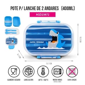 A hora do lanche ficou muito mais divertida com o pote para lanche de 2 andares da coleção PIMPOLHOS. Com capacidade para 400ml, possui divisórias na parte inferior para facilitar a separação dos alimentos e uma bandeja com encaixe para os talheres que acompanham o kit; e tampa com fechamento em travas de segurança. É perfeito para passeios, viagens e escolinha. Produto livre de BPA e com qualidade Jacki Design. Conheça a linha completa da coleção PIMPOLHOS e complete o seu kit! (INSTRUÇÕES DE USO: Retire a tampa antes de levar ao micro-ondas; usar somente para aquecer comida, não para cozinhar; Vai ao freezer e lava-louças; Temperatura de uso: -20C ~100C; Limpe usando uma esponja macia e detergente neutro.