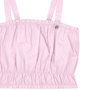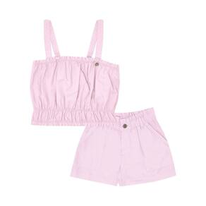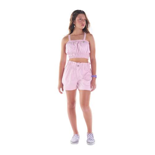 Para as garotas, todo conforto e estilo do verão! O conjunto possuí duas peças confeccionados em tecido sarja na corlavanda sendo a blusa cropped com alças e elásticos no peito e barra, e o short com elastano no cós e fechamento em zíper com botão. As peças podem ser usadas separadamente, aumentando as chances de diversas composições de looks.