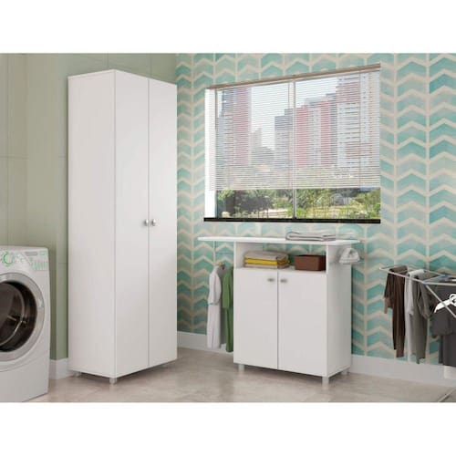 Se você gosta de organização e praticidade na sua área de serviço, vai adorar o Conjunto Neve. Ele é composto por um armário espaçoso, cabe vassoura, rodo e tudo o que você precisa guardar quando o assunto são materiais de limpeza. Além de uma tábua de passar organizadora, com espaço para pendurar roupas e o ferro. Super bonito e com visual super clean, ele é a opção ideal para deixar o espaço do seu jeito. Aproveite. Possui Portas: 02 Possui Rodízio: Não Que tal trazer um pouco da decoração portugu: Se você gosta de organização e praticidade na sua área de serviço, vai adorar o Conjunto Neve. Ele é composto por um armário espaçoso, cabe vassoura, rodo e tudo o que você precisa guardar quando o assunto são materiais de limpeza! Além de uma tábua de pa Ambiente: Banheiro Armário de Cozinha Portuguesa Espresso Móveis: Conjunto Lavanderia com Armário e Tábua de Passar Organizadora Neve Espresso Móveis Cor: Branco Informação Complementar: 1x Tábua de Passar com Organizador TP3000 Branco Largura: 112 cm Profundidade: 36,5 cm