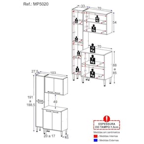Produto Composto Por: 1 Armário 2 Portas, 1 Armário Aéreo 2 Portas, 1 Balcão 2 Portas, Manual de Montagem E. Kit Ferragem.