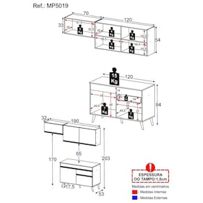 Dimensões do produto montado: Altura: 203cm | Largura: 190cm | Profundidade: 32cm (aéreos) - 53cm (balcão com tampo) *Você pode consultar as medidas internas na imagem técnica do produto.
