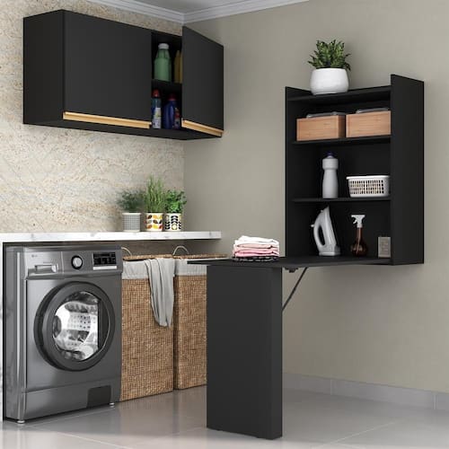O Conjunto Lavanderia Multiuso Armário e Mesa Dobrável Multimóveis MP5018 tem um excelente custo benefício e um amplo espaço interno. Produzido em MDP com acabamento acetinado (cerca de 20% de brilho), que garante maior durabilidade e resistência, o armário aéreo possui duas prateleiras internas e puxadores em ABS. Para otimizar o seu ambiente, possui também um armário com prateleiras e mesa dobrável.
