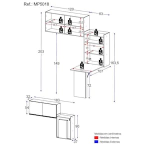 Dimensões do produto montado: Altura: 203cm | Largura: 183cm | Profundidade: 32cm (aéreo) - 107cm (mesa dobrável aberta) *Você pode consultar as medidas internas na imagem técnica do produto.