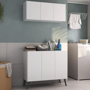 Transforme sua lavanderia num ambiente funcional e elegante com o Conjunto Lavanderia Retrô Multiuso Armário Aéreo e Balcão 3 Portas Multimóveis MP5050. Fabricado em MDP (15mm) com acabamento acetinado (cerca de 20% de brilho), garante durabilidade e resistência. Composto por um balcão e um armário aéreo com 3 portas e prateleiras, este kit oferece amplo espaço interno para organizar produtos de limpeza e outros itens de lavanderia. O balcão ainda permite apoiar suas roupas, deixando o ambiente organizado, e possui pés retrô em polipropileno que oferecem estabilidade e um charme vintage. O design clean confere um visual moderno e estiloso ao kit. Conteúdo da Embalagem: 1 (um) Balcão 1 (um) Armário Aéreo Manual de Montagem Kit Ferragem
