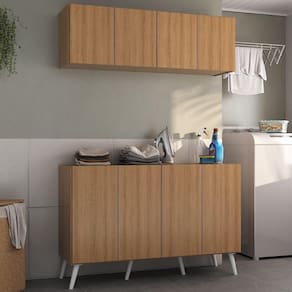 Transforme sua lavanderia num ambiente funcional e elegante com o Conjunto Lavanderia Retrô Multiuso Armário Aéreo e Balcão 4 Portas Multimóveis MP5053. Fabricado em MDP (15mm) com acabamento acetinado (cerca de 20% de brilho), garante durabilidade e resistência. Composto por um balcão e um armário aéreo com 4 portas e prateleiras, este kit oferece amplo espaço interno para organizar produtos de limpeza e outros itens de lavanderia. O balcão ainda permite apoiar suas roupas, deixando o ambiente organizado, e possui pés retrô em polipropileno que oferecem estabilidade e um charme vintage. O design clean confere um visual moderno e estiloso ao kit.