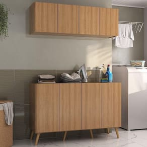 Transforme sua lavanderia num ambiente funcional e elegante com o Conjunto Lavanderia Retrô Multiuso Armário Aéreo e Balcão 4 Portas Multimóveis MP5053. Fabricado em MDP (15mm) com acabamento acetinado (cerca de 20% de brilho), garante durabilidade e resistência. Composto por um balcão e um armário aéreo com 4 portas e prateleiras, este kit oferece amplo espaço interno para organizar produtos de limpeza e outros itens de lavanderia. O balcão ainda permite apoiar suas roupas, deixando o ambiente organizado, e possui pés retrô em polipropileno que oferecem estabilidade e um charme vintage. O design clean confere um visual moderno e estiloso ao kit.