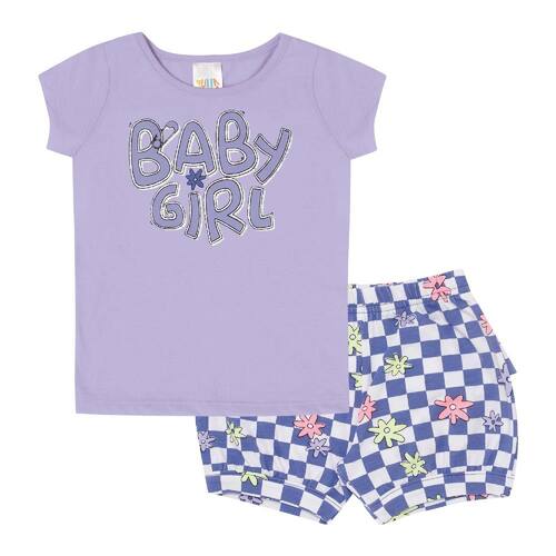 Nesta Primavera sua bebezinha vai ficar uma fofura com esse conjuntinho. Uma Blusa na cor Lilás com a estampa “Bebê menina” e detalhes em foil confeccionada em Meia malha, e um Shorts xadrez na cor Mirtilo com estampa rotativa de florezinhas confeccionado em cotton leve proporcionando ainda mais conforto e leveza para os looks da sua pequenina.
