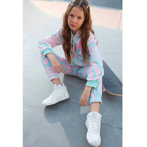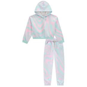 Conjunto de blusão boxy baggy e calça jogger em moletom 3 cabos estampado com rosa e verde claro. Blusão com capuz e cordão ajustável, punhos e barra em ribana e calça com elástico na cintura e nas barras, cordão ajustável verde claro.