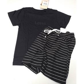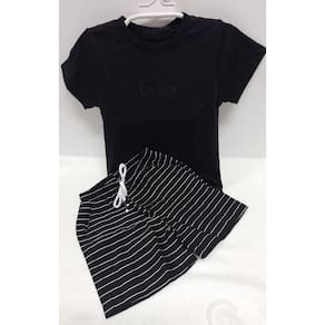 - Camiseta em malha 100% algodão, super macia e confortável. Modelo básico, detalhe estampado da marca na frente. Gola redonda. - Bermuda super macia, leve e confortável. Bolsos laterais. Estampa listrada maravilhosa e cordão aplicado na frente. Cós de elástico. Conjunto maravilhoso para os dias mais quentes.