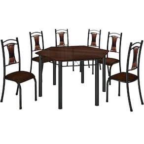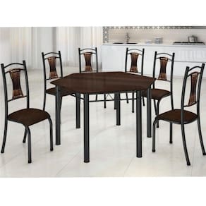 Estrutura: : : Tubos de Aço reforçado, com acabamento em pintura epóxi, atóxicaTampo: : : Formato Sextavada, pedra de ardosia com acabamento em pintura que imita madeiraCadeiras: : : 06 cadeiras, de tubo de aço craqueado, revestimento do assento em corino Largura do tampo: : : 140,0 cmProfundidade do tampo: : : 122,0 cmEspessura do tampo: : : 2,0 cmAltura da base: : : 75,0 cmLargura da cadeira: : : 39,0 cmAltura da cadeira: : : 102,0 cmProfundidade da cadeira: : : 47,0 cmLargura do acento: : : 39,0 cmProfundidade do acento: : : 40,0 cmPeso Total: : : 105,0 kgGarantia: : : 03 mesesInformações Sobre Montagem: : : Não possuímos serviço de montagem.