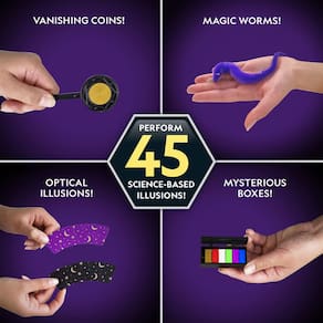 - ADEREÇOS CLÁSSICOS DO KIT MÁGICO — As crianças aprenderão as técnicas por trás de muitos truques de mágica famosos, incluindo ilusões que usam copos e bolas, uma ponta falsa do polegar, a bola e o vaso, uma caixa de moedas misteriosa e uma varinha mágica.