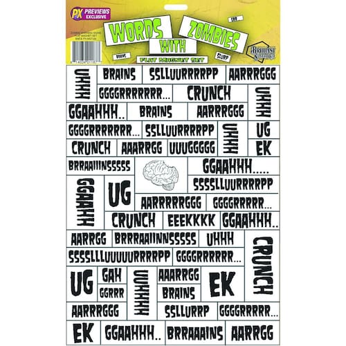 Prática falando zumbi, ou deixe mensagens para os zumbis em sua casa, com as palavras com zumbis as exclusivo ímã conjunto. Cada pequeno ímã tem uma palavra como diferente, "arrrgh," "uuuhh," ou "cérebros", e eles podem ser organizados e qualquer coisa para criar frases e frases. Antes de Você sabe, as palavras com zumbis as exclusivo ímã conjunto terá você fluente em zumbi como alguém que foi morto por anos. Idades acima de 13 anos.