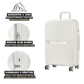 Marca: Polo King Material: Polipropileno resistente e brilhante, proporcionando durabilidade e estilo Garantia: Vitalícia pelo fabricante Sistema Spinner: 4 rodas duplas com giro 360 para fácil mobilidade em qualquer superfície Carrinho: Retrátil em alumínio com botão liberador para conforto e praticidade Alças: Superior e lateral reforçadas e emborrachadas para transporte seguro Expansor: Zíper expansor que aumenta a capacidade da mala para mais espaço Cadeado: Tripla combinação para maior segurança Detalhes Internos: