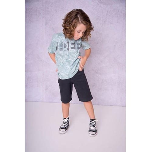 Conjunto camiseta manga curta estampada, bermuda moletinho com 3 bolsos Passagem Secreta